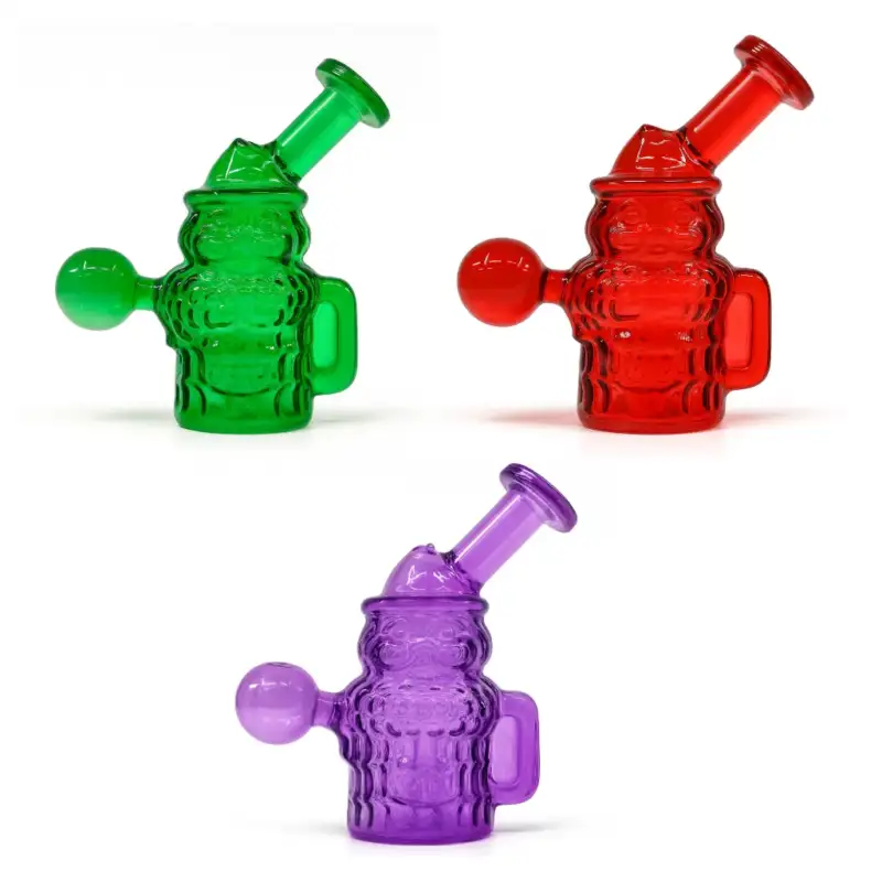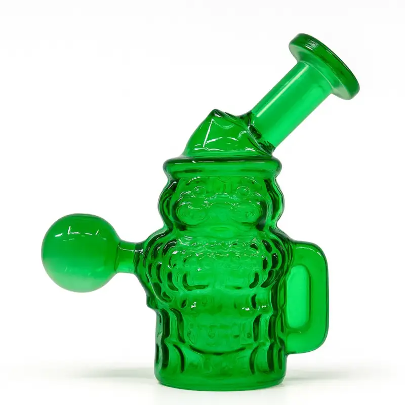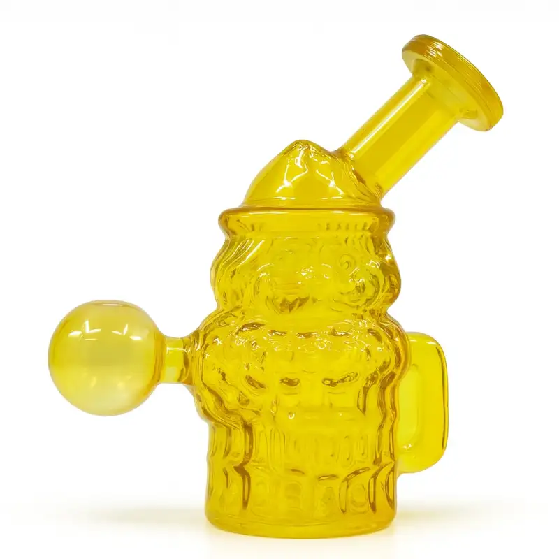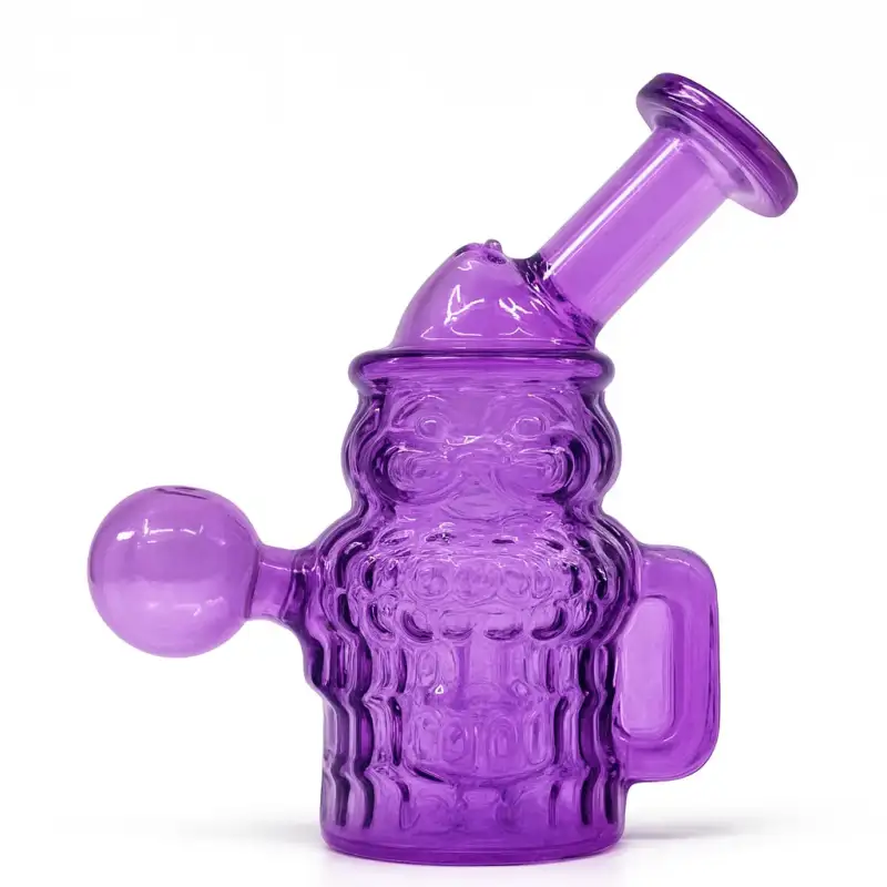 The 5-inch Cat-in-Hat Oil Burner combines playful character design with everyday functionality. Crafted from durable colored borosilicate glass, this unique piece features a sculpted whimsical face that resembles a cartoon-style “cat in a hat” (or storybook character). Its compact design makes it perfect for personal use while still delivering reliable performance. The side-handle adds grip, and the angled mouthpiece ensures a smooth, comfortable session.