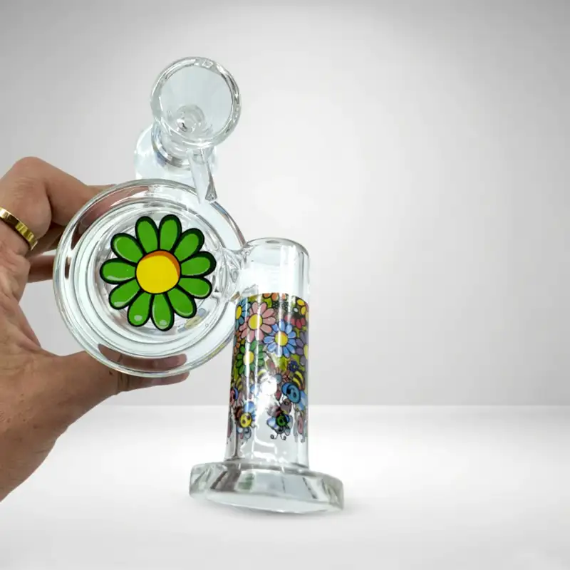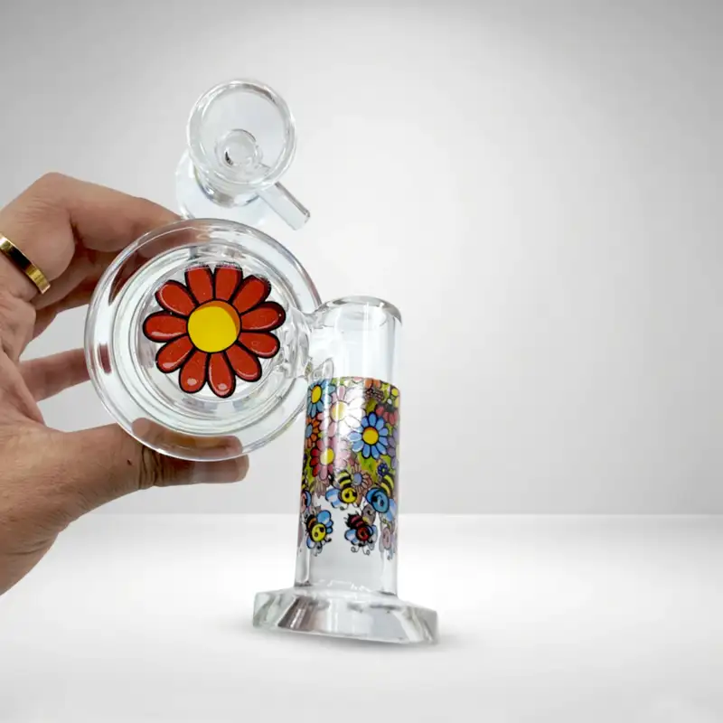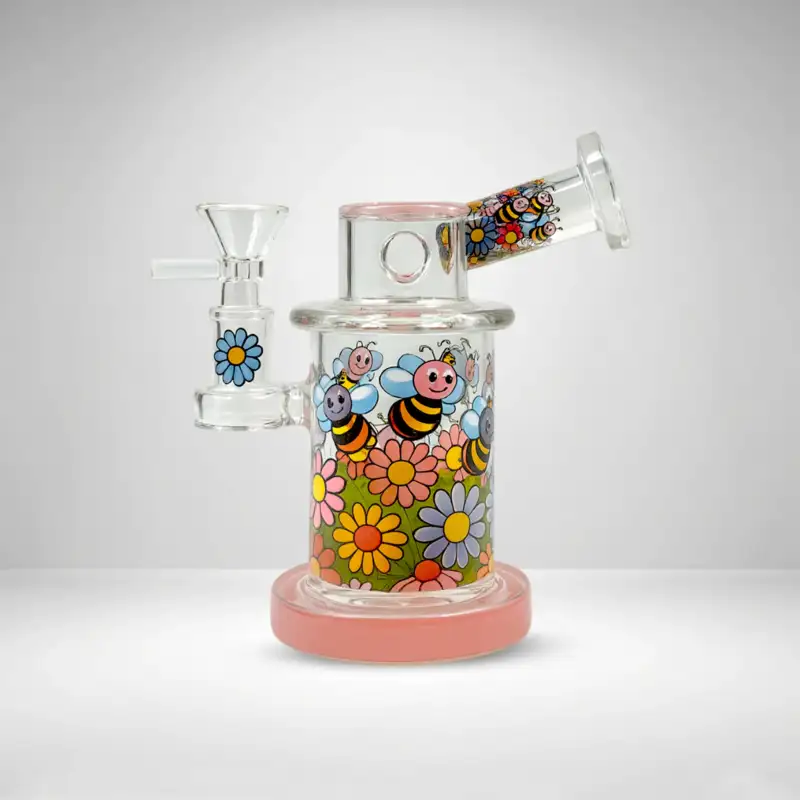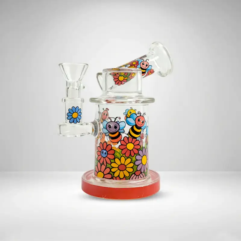 The 5-inch Busy Bee Dab Rig combines playful design with everyday function. Crafted from durable borosilicate glass, it features a cylindrical chamber fully wrapped in buzzing bees and colorful flower patterns. The wide base ensures stability, while the compact size makes it perfect for flavorful, efficient hits. Each rig includes a flower decal on the bowl and vibrant colored accents on the base.