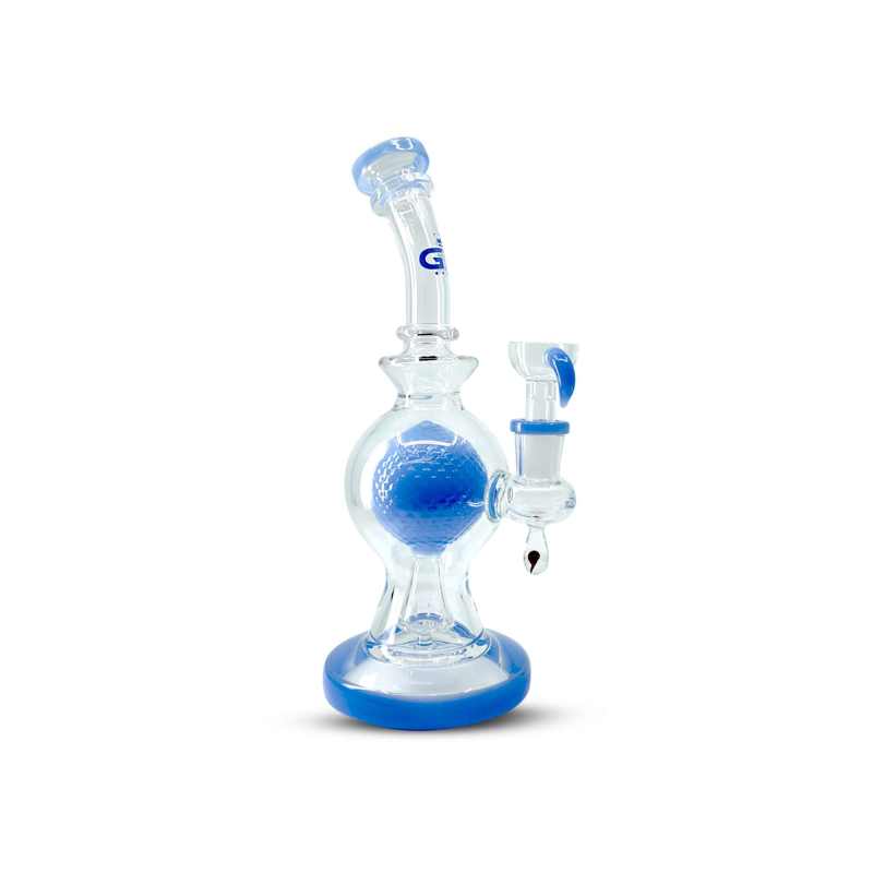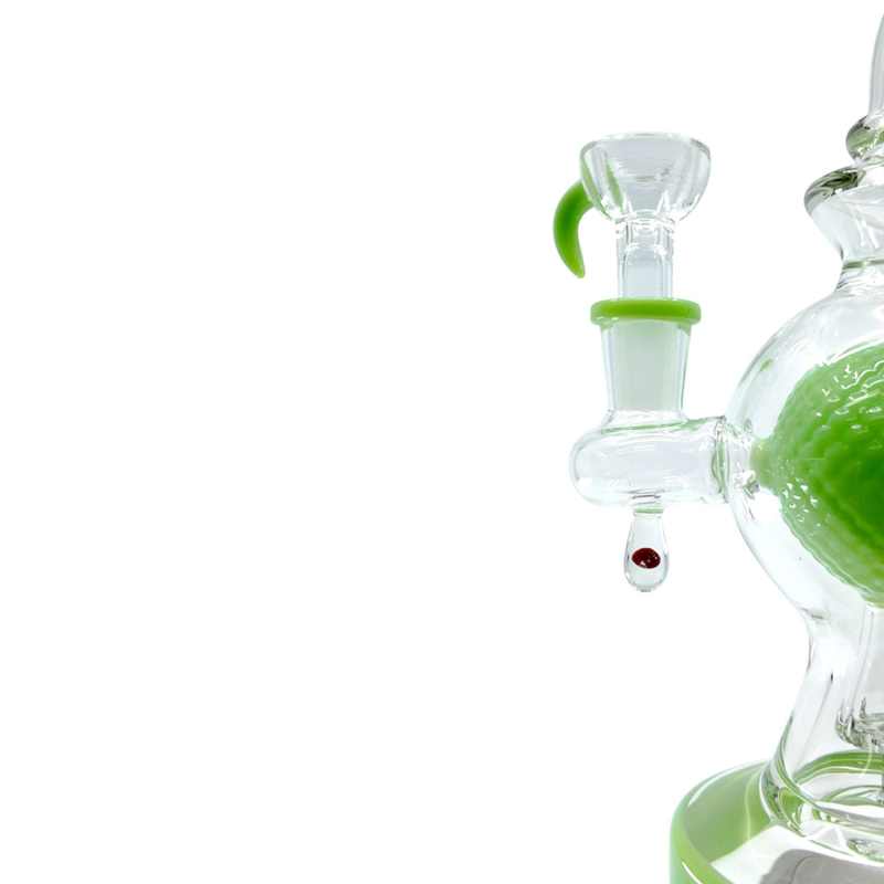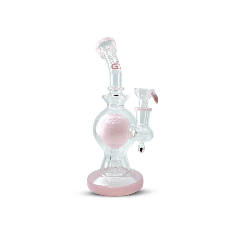 Bring style and smooth function together with this 9-inch Golf Ball Perc Glass Water Pipe. Crafted from durable borosilicate glass, it features a unique golf ball-inspired percolator inside the chamber that ensures smooth, filtered hits every time. The accented rim, base, and bowl handle give it a colorful finish, making it stand out in any collection.