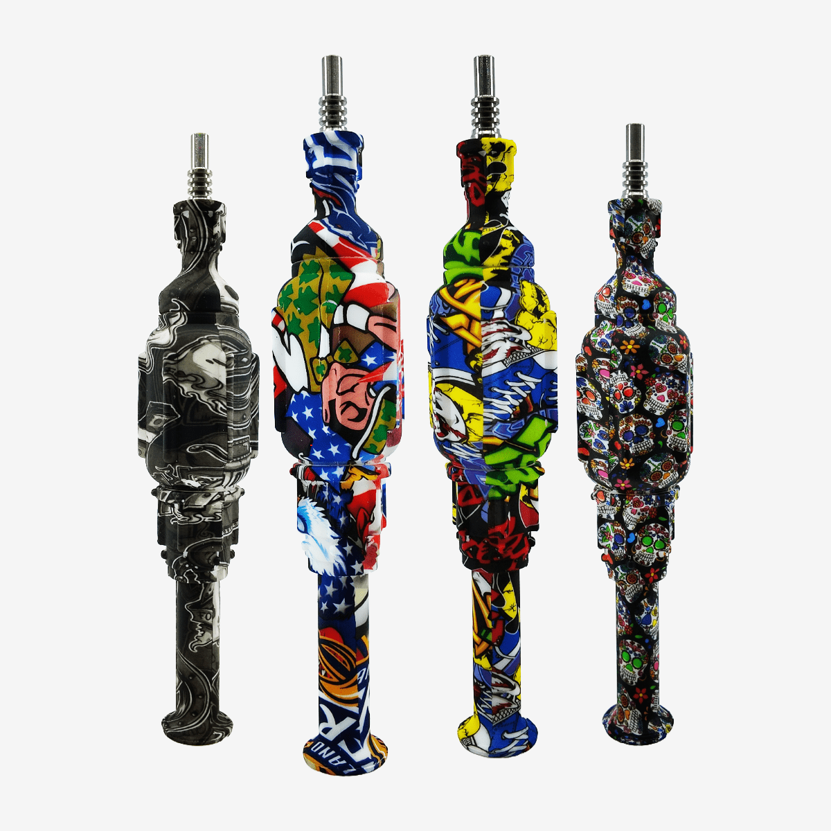The 10mm Print Silicone Nectar Collector is a versatile and stylish concentrate consumption device designed for portability and ease of use.This innovative nectar collector combines functionality with visual appeal. The high-quality silicone body features a vibrant printed design, making it both a practical tool and a stylish accessory. The 10mm titanium nail ensures optimal heat retention and efficient vaporization of concentrates, while the silicone construction offers durability and heat resistance.