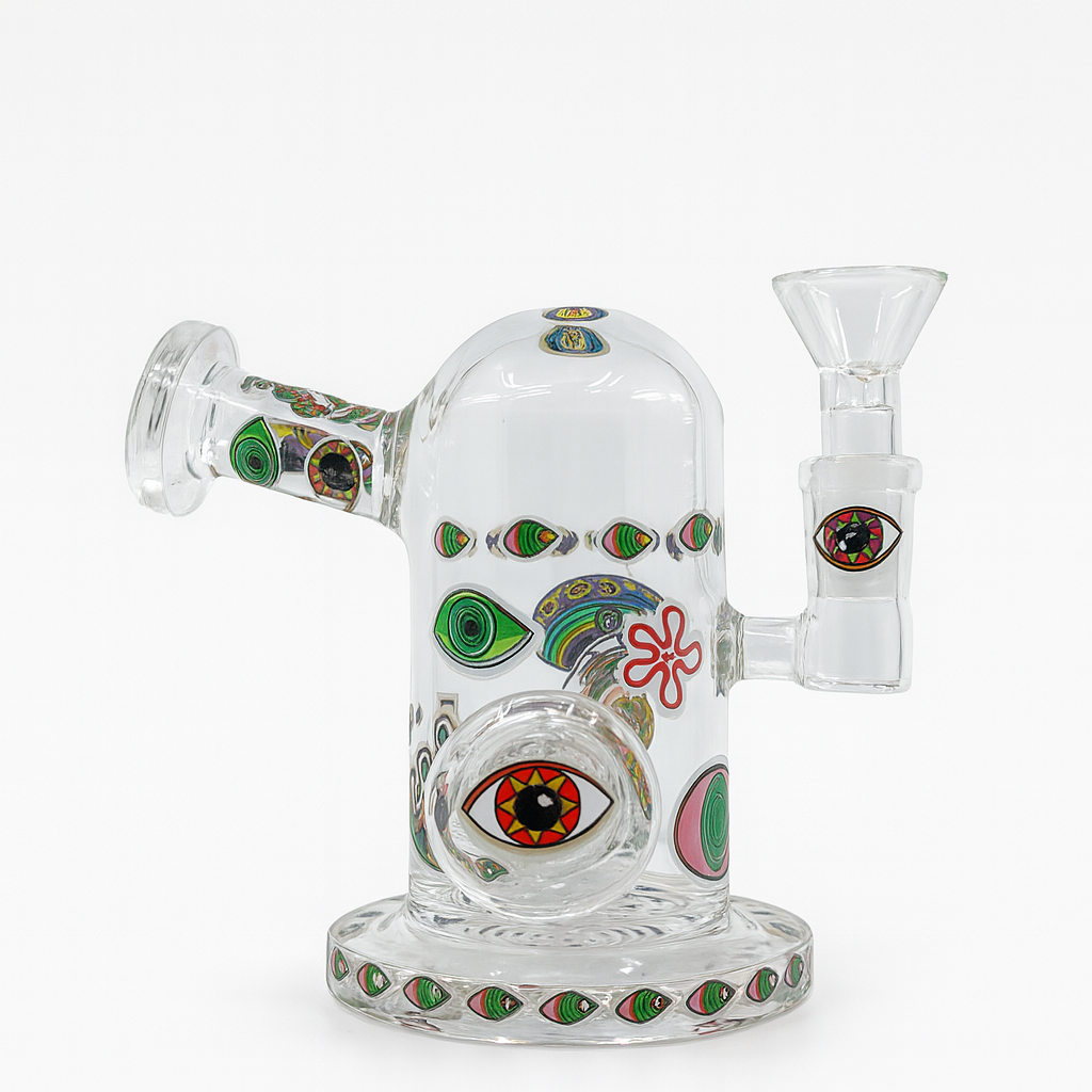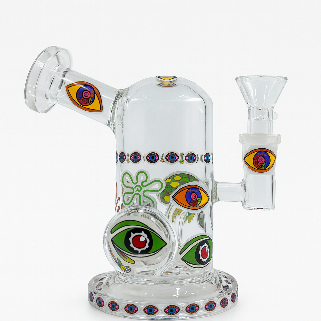 The 5-inch Psychedelic Dab Rig brings a playful yet trippy vibe to your collection. Designed with vibrant cartoon-style Sponge and all-seeing eye patterns, it’s crafted from durable borosilicate glass for smooth sessions. The wide base ensures stability while the angled mouthpiece provides comfort and control. A standout piece that fuses fun design with reliable function.